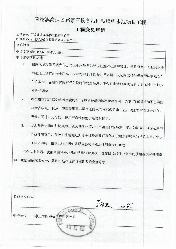 京港澳高速公路京石段全线收费站区增设中水池工程变更申请报告