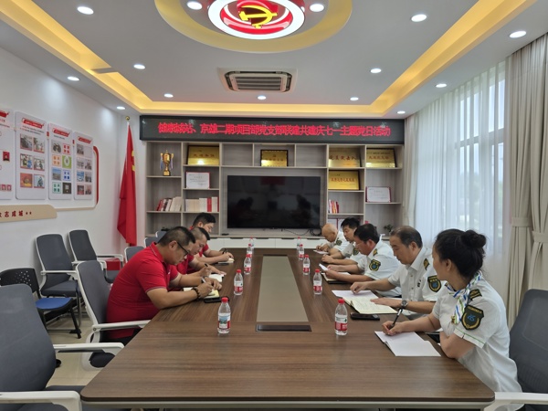 活动由健康城站党支部书记开场致辞,介绍活动背景与意义,强调安全注意事项;随后的党史学习环节,通过支部书记讲解的形式,带领党员们回顾党的光辉历程,激发爱党爱国情怀。党史学习后,两支部围绕京雄二期施工车辆超限超载治理问题展开专题研讨。党员们结合健康城站与京雄二期项目的实际工作场景,深入分析当前治理工作中存在的难点进行研讨,旨在通过党建引领,凝聚治理合力,筑牢安全防线。最后,全体党员与作品合影留念,定格这一意义非凡的时刻。