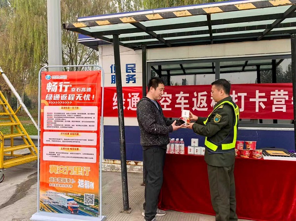 为积极响应公司“一站一特色”引流活动号召,加速推进“空车配载”专项工作,高碑店收费站作为绿通运输枢纽大站,于11月5日在站口开展“绿通车空车返程打卡营销”活动,以“看得见的实惠”精准吸引绿通返程空车选择高速公路,全力冲刺年度目标任务。