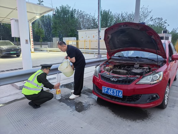 4月24日傍晚7时左右,一辆小型客车停靠在京石高速涿州收费站出站口,司机神情焦急,向现场工作人员求助,自述车辆水箱开裂漏水,想要就近寻找修理厂检修。