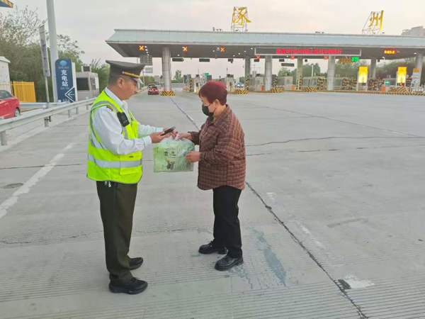 为及时化解司乘矛盾、保障车辆正常通行,工作人员第一时间安抚双方情绪,值班站长主动与司机沟通,协商解决方案。因行程紧张不便久留,司机无奈恳请收费站临时代为保管特产,并表示会立即联系家人尽快前来领取。工作人员暖心回应,承诺妥善保管物品、全程负责看护。约四十分钟后,司机岳母赶到收费站。工作人员现场电话联系司机核实身份信息,确认无误后,顺利将特产完好转交其家属。