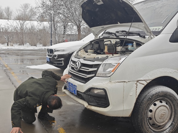 “雪天行车,安全一点不能马虎。”车辆管理员李勇半跪在积雪里,对班车进行出发前检查。他手持强光电筒仔细敲击轮胎、察看底盘。检查完最后一辆车,他的膝盖处已是一片湿泞,却保障了车辆安全。
