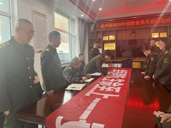 举行启动仪式,吹响消防“集结号”。涿州站高度重视,隆重举行消防宣传月活动启动仪式。仪式上,站长发表动员讲话,明确活动意义与要求,全体人员在条幅上郑重签名承诺,正式拉开了消防宣传月系列活动的序幕,营造了“人人参与消防、共筑平安站区”的积极氛围。